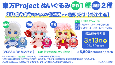 【Gift】東方ぬいぐるみシリーズ新作1種・再販2種通販受付中!(さくや/れみりあ/ふらん)