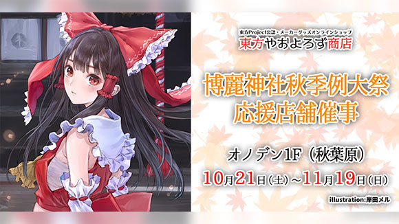 11/12(日)第十回博麗神社秋季例大祭へ「東方やおよろず商店」ブース出展決定!秋季例大祭に先駆けて10/21(土)~オノデン1Fにて応援店舗催事も開催