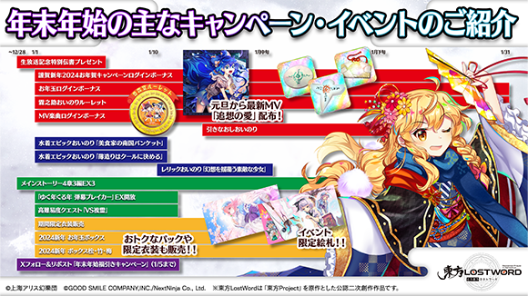 株式会社グッドスマイルカンパニーと株式会社NextNinjaの共同プロジェクトである、東方Project公認二次創作スマートフォン向けRPG『東方LostWord(とうほうロストワード)』の年末年始のイベントのご紹介と、1月1日(祝)0:00公開予定の新アレンジ楽曲をお知らせします。