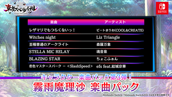 Nintendo Switch™ダウンロード専用ソフト「東方スペルバブル」の追加ダウンロードコンテンツ「霧雨魔理沙楽曲パック」を1月18日(木)より配信開始いたしました!