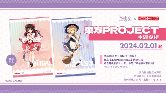 “Akiba Hobby’s Touhou Project goods are now available at shop 【万番屋】in Shanghai, China! Free postcard campaign is also being held!”