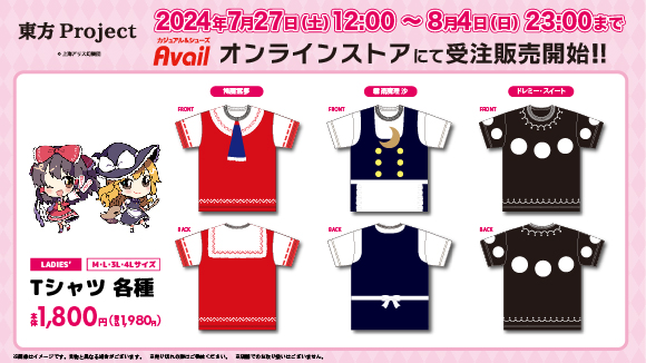 【東方Project 】 7/27(土) 12:00よりアベイル オンラインストアより博麗霊夢 霧雨魔理沙 ドレミー・スイートのTシャツが受注販売開始!