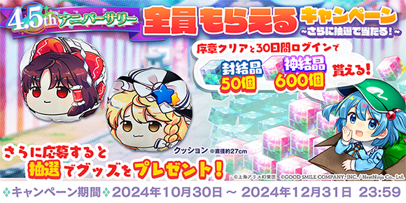 実施期間中に「序章クリア」&「合計30日間ログイン」で、全員に「神結晶」をプレゼント!さらに、東方LostWordのクッションが抽選で当たりますので、ぜひ奮ってご参加ください。