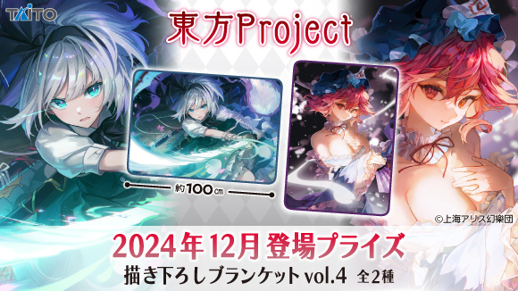 グッズ Twitter Twitter Facebook Line 2024.12.02 TAITO 「東方Project 描き下ろしブランケットvol.4」がアミューズメント施設に登場! マルチクロスで好評だった久蒼穹先生、新生美森先生の 描き下ろしイラストを使用したブランケットが登場です。 サイズ:約100cm 種類:全2種 取り扱い店舗などの詳細はタイトー公式サイトでチェック! タイトー公式サイト