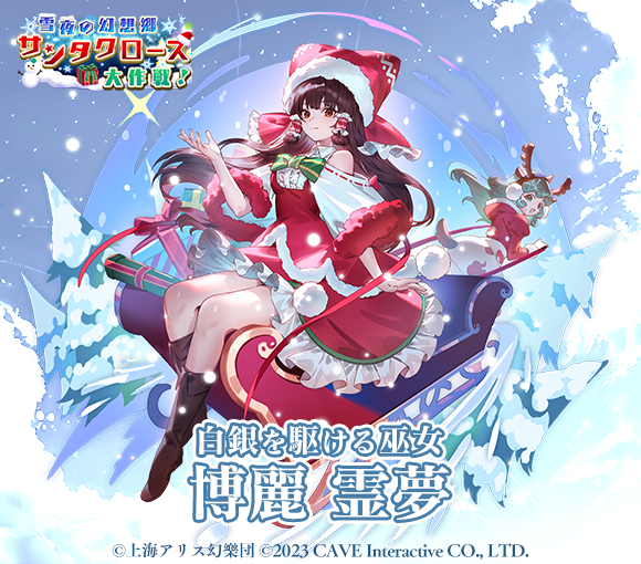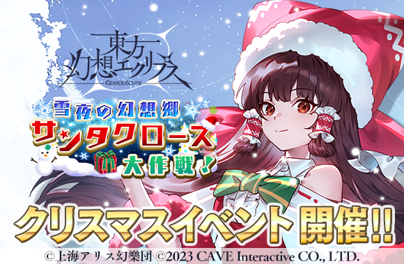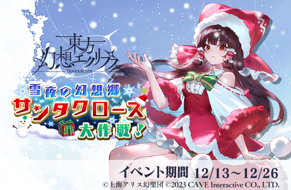株式会社ケイブが配信中のシューティングゲームアプリ『東方幻想エクリプス』(『ゲンリプ』)が、2024年12月13日(金)よりイベント『雪夜の幻想郷 サンタクロース大作戦!』を開催、さらに新キャラクター[白銀を駆ける巫女]博麗霊夢が登場する願掛けを開始いたしました。