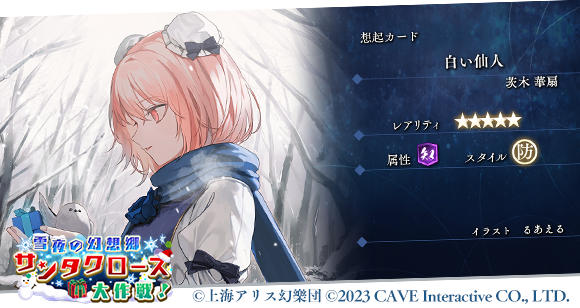 12月13日(金) より、想起カード『サイレンナイト・ホーキーナイト』の出現率が上昇している期間限定の願掛け『季節限定 Xmas魔理沙ピックアップ 追憶の願掛け』を開催しております。