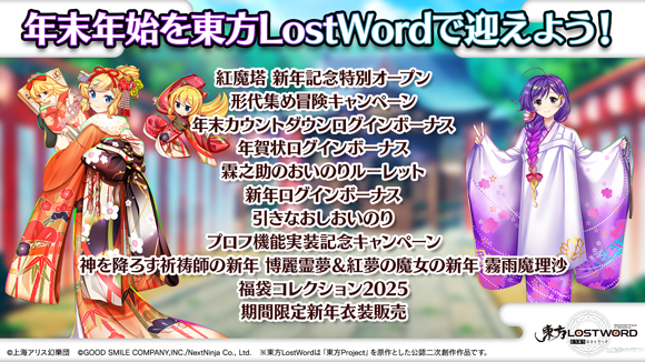 皆様の支えで10月に4.5周年を迎えた東方LostWordですが、年末年始には多くのイベントやキャンペーンを実施いたします!本日19:00に行った公式生放送で発表した内容から一部を抜粋し、さらに来年6月に実施予定のリアルイベントの情報をご紹介します。