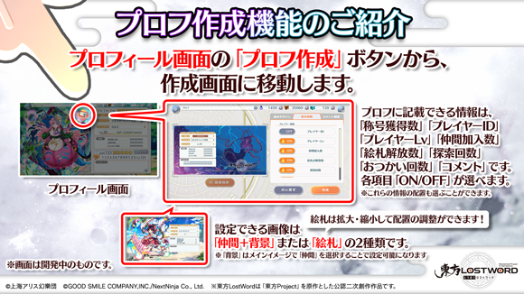 12月26日のアップデートで、プロフ作成機能が追加されました。お気に入りの絵札や仲間と背景を使ってプロフ作成できるようになりました。好きなキャラクターを公開したり、お友達を探すために使うことができます。