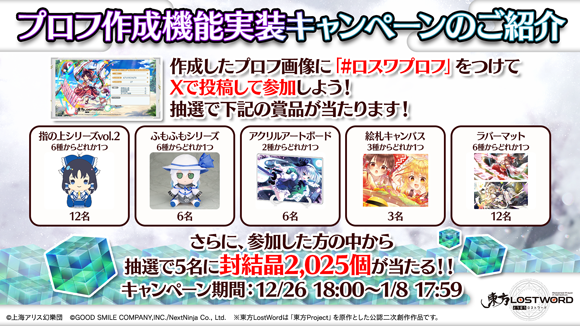 12月26日18:00から、東方LostWordの公式Xにて「#ロスワプロフキャンペーン」を実施します。キャンペーン対象の投稿からボタンを押して、プロフ作成でできた画像を添付することで参加できます。#ロスワプロフの投稿数に応じてゲーム内アイテムを全員にプレゼント。さらに抽選で5名様に封結晶2025個や、ロスワグッズが当たります。