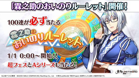 1月1日0:00~合計で10日間、毎日最大で100連のチャンス!「霖之助のおいのりルーレット」が今年も開催されます。10・20・30・100連のどれかがルーレットで当たり、ガチャを引くことができ、10日目には必ず100連がもらえるログインボーナスです。
