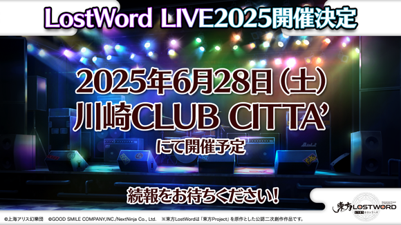 2025年6月28日(土)には東方LostWordを楽しんでいただいている皆さまへの感謝の気持ちを込めて、川崎のCLUB CITTA’でライブ開催を予定!詳しい情報やチケット販売の時期などは、来年の生放送で随時ご紹介を予定しています!