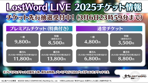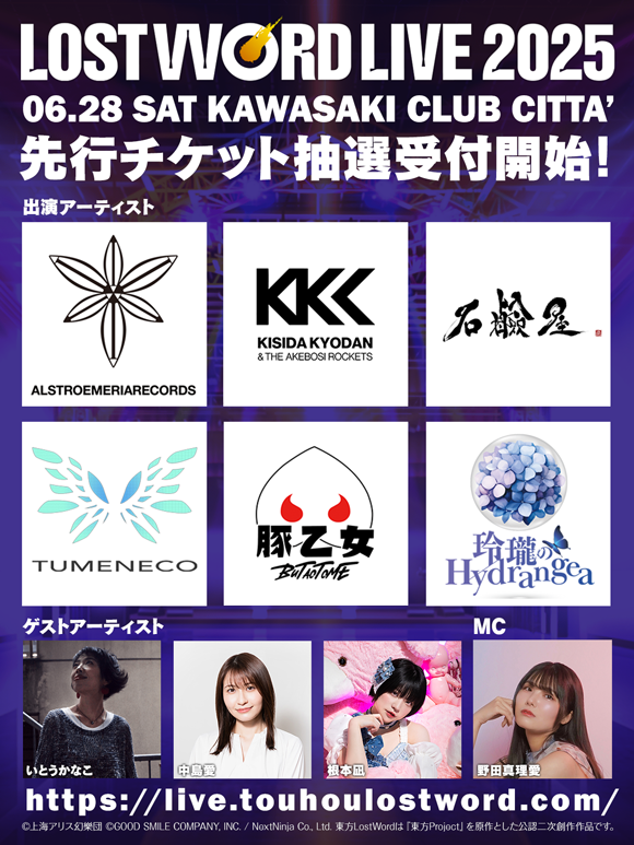 2025年6月28日(土)には東方LostWordを楽しんでいただいている皆さまへの感謝の気持ちを込めて、川崎のCLUB CITTA’でライブを開催します!本日2月27日(木)20:00に、チケットの先行予約を開始いたします。