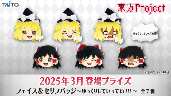 グッズ Twitter Twitter Facebook Line 2025.03.07 TAITO 「東方Project フェイス&セリフバッジ ~ゆっくりしていってね!!!~」がアミューズメント施設に登場! ゆっくり魔理沙とゆっくり霊夢が約7㎝のフェイス&セリフバッジになって登場です。 背面に安全ピン付きで、様々な表情のゆっくり魔理沙とゆっくり霊夢、「ゆっくりしていってね!!!」のセリフ等がラインナップです。 サイズ:約7cm 種類:全7種 取り扱い店舗などの詳細はタイトー公式サイトでチェック! タイトー公式サイト