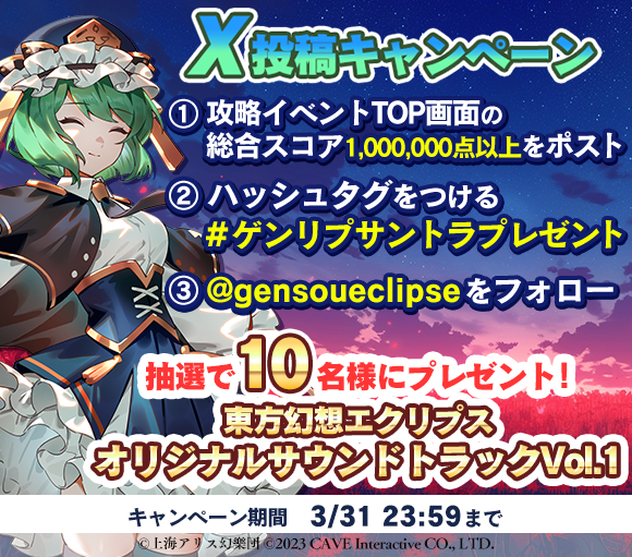 期間中に東方幻想エクリプスの公式アカウント(@gensoueclipse)をフォローした上、ハッシュタグを付けて対象内容をポストした方から抽選10名様に「東方幻想エクリプス オリジナルサウンドトラック Vol.1」をプレゼント!是非ご参加ください!
