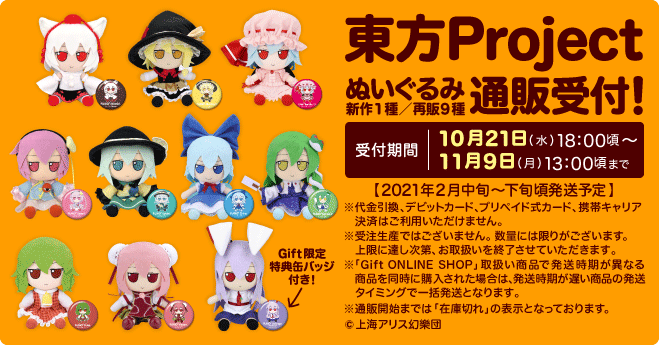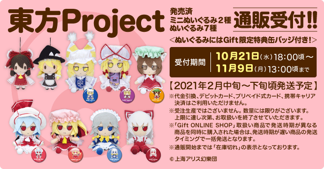 『東方Project』のぬいぐるみ新作1種・再販9種・発売済9種をGiftオンラインショップにて<10月21日18:00頃より>通販受付開始予定!この機会にぜひお買い求めください!