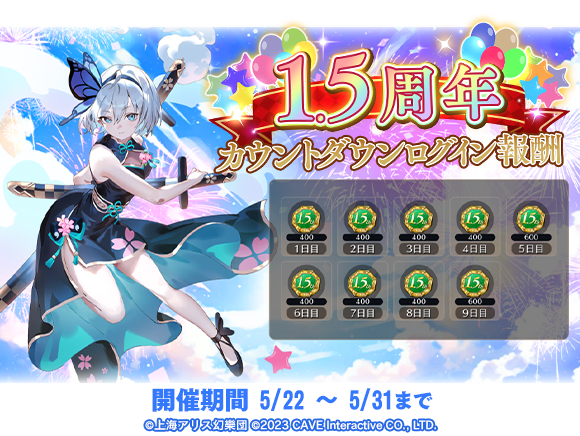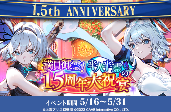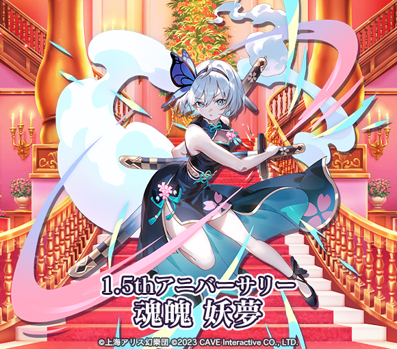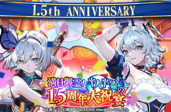 2025年5月16日(金)よりイベント『満員御霊!半人半霊の1.5周年大祝宴』を開催、さらに新キャラクター[1.5thアニバーサリー]魂魄妖夢&十六夜咲夜が登場する願掛けを開始いたしました。