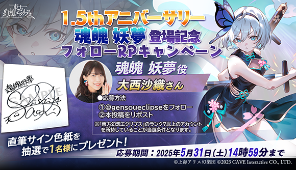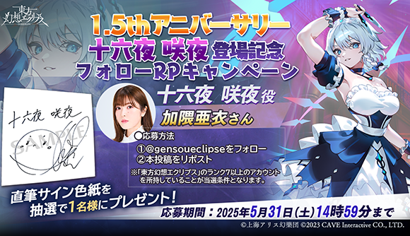 期間中に東方幻想エクリプスのX公式アカウント(@gensoueclipse)をフォローした上、対象投稿をリポストした方から抽選各1名様に該当キャラクターを演じた声優さんのサイン色紙をプレゼント!是非ご参加ください!