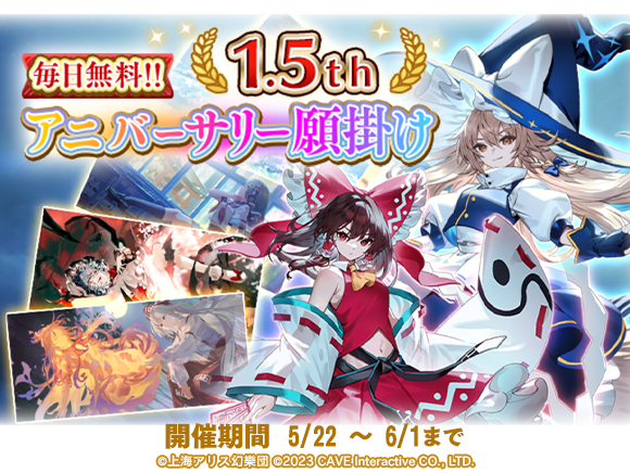 『限定 1.5thアニバーサリー妖夢 ピックアップ 遭逢の願掛け』、『限定 1.5thアニバーサリー咲夜 ピックアップ 遭逢の願掛け』が開催中です。