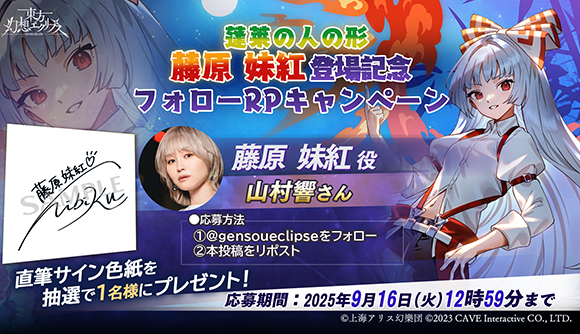 期間中に東方幻想エクリプスの公式アカウント(@gensoueclipse)をフォローした上、対象投稿をリポストした方から抽選1名様に該当キャラクターを演じた声優・山村響さんのサイン色紙をプレゼント!ぜひご参加ください!