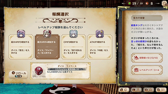 CPというパラメータを使うことで、不運な展開をやり直す事ができます。CPはレベルアップで成長させることも出来ますが、代わりに他のステータスが上がりにくくなるデメリットも。