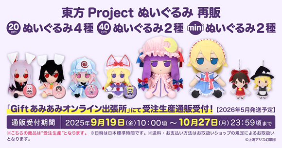 東方ぬいぐるみ再販8種が「Giftあみあみオンライン出張所」にて通販受付中!(受注生産)