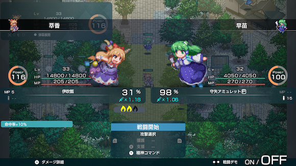 武器ごとに違った多彩なバトルアニメーションによって展開される敵との戦闘。斬る、撃つ、殴るのアクションから「東方Project」らしい「スペルカード」を使った必殺技まで、美しい幻想郷で躍動するキャラクターたちの活躍をお楽しみください。