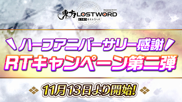 公式Twitterで東方LostWordのハーフアニバーサリーを記念した、フォロー&RTキャンペーンを開始いたします。当選者はなんと合計9,999名!