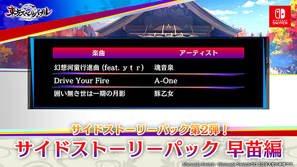 本パックでは、新たに「幻想河童行進曲 (feat. ytr)」「Drive Your Fire」「囲い無き世は一期の月影」の3曲が追加され、さらに東方スペルバブルの世界をお楽しみいただける追加ダウンロードコンテンツとなっております。