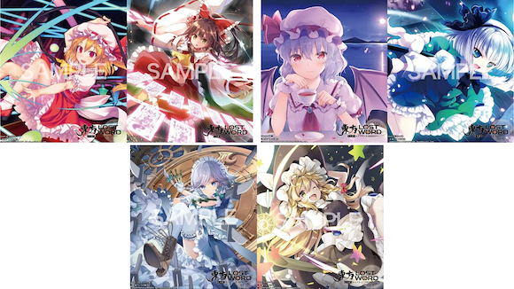 東方LostWordゲーム内で使用されているイラスト全6種を用いたトレーディングミニ色紙です。