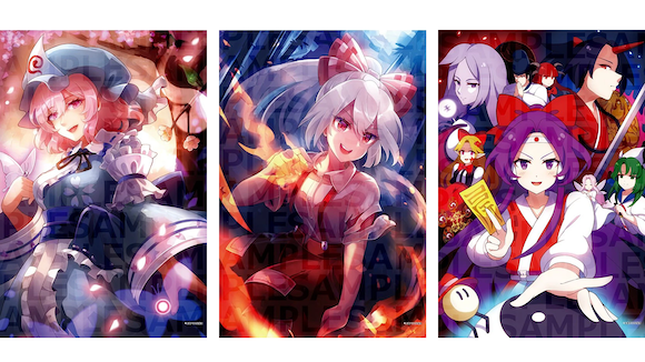 西行寺幽々子、藤原妹紅、ホリズムリバー楽団のほか、毎回ご好評をいただいている旧作キャラ集合絵の新ラインナップとして東方靈異伝が新登場です。