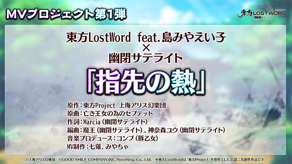 【東方LostWord】MV第1弾、島みやえい子 × 幽閉サテライト『指先の熱』のフルver.を公開!