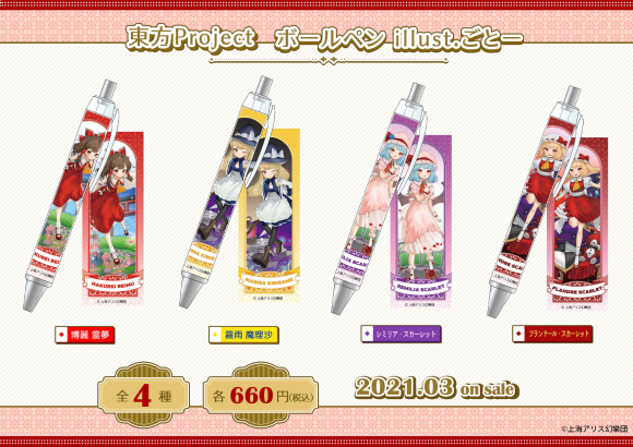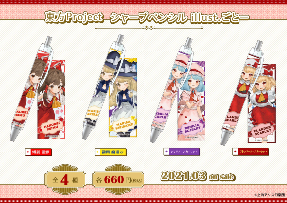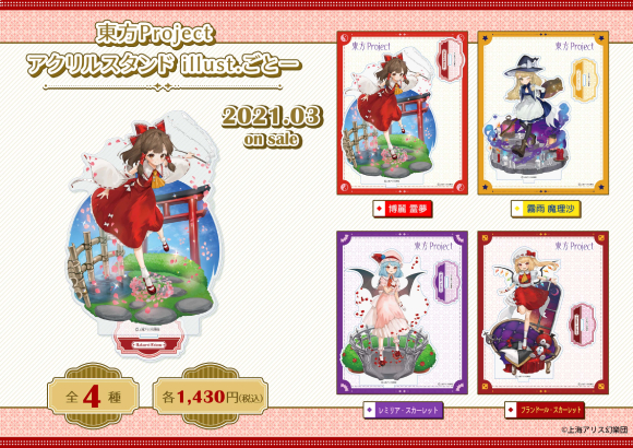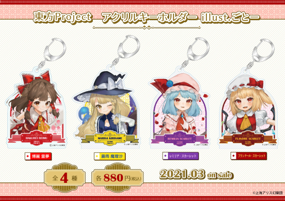 各商品、霊夢、魔理沙、レミリア、フランドールの4種類、ただいま各お取り扱い店様にて予約受付中です!ぜひご予約ください!