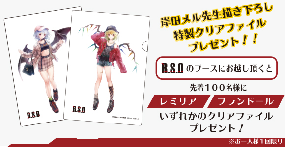 今回はご好評頂いております岸田メル先生描き下ろしのレミリアとフランドールのクリアファイルをブースにお越し頂いた方にプレゼント致します!