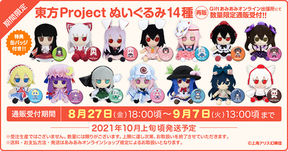 『東方Project』のぬいぐるみ再販14種を「Giftあみあみオンライン出張所」にて<8月27日18:00頃より>通販受付開始予定!