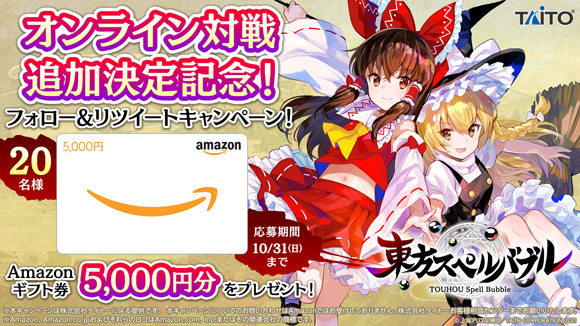 オンライン対戦追加決定を記念して東方スペルバブル公式Twitterにてリツイートキャンペーンを開催中! 東方スペルバブル公式Twitterをフォロー&対象ツイートをリツイートでAmazonギフト券5,000円分を抽選で20名様にプレゼント!