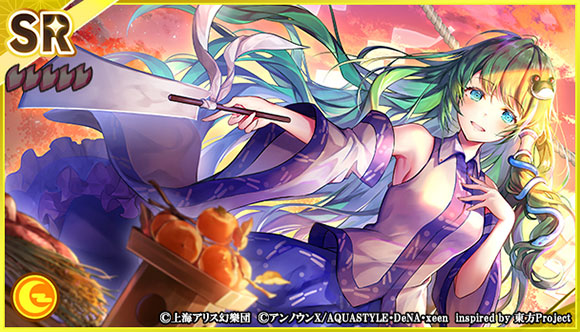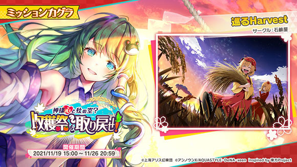 2021年11月19日(金)に、イベント「神様心と秋の空?収穫祭を取り戻せ!」を開始しました。本イベントの報酬として、SRミタマカード「[豊穣神不在の収穫祭]東風谷 早苗」やSRミタマカード「[月天豊穣祭]蓬莱山 輝夜」がもらえます。