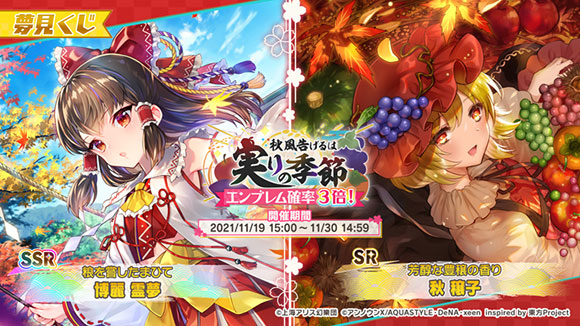 SSRミタマカード「[粮を嘗したまひて]博麗 霊夢」、SRミタマカード「[芳醇な豊穣の香り]秋 穣子」が登場!秋 穣子は『ダンカグ』初登場です!