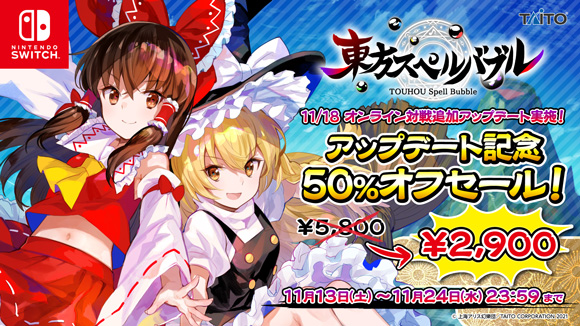 Nintendo Switch™ダウンロード専用ソフト「東方スペルバブル」のオンライン対戦を含む大型アップデートを11月18日に実施いたしました!さらに、追加ダウンロードコンテンツとして「魂音泉楽曲パック」の配信も開始!