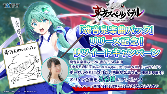 『魂音泉楽曲パック』のリリースを記念してリツイートキャンペーンを開催!東方スペルバブル公式Twitter(@touhouSB)をフォロー&リツイートで伊藤かな恵さんのサイン色紙を抽選で3名様にプレゼント!