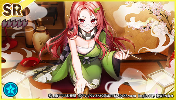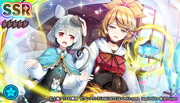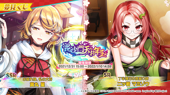 現在開催中の第一弾「大晦日SSR確定夢見くじ」では、SSRミタマカード「[其は儀狄之酒]八雲 紫」、「[遥か見渡すテレグノシス]犬走 椛」、「[Knight of the Night]十六夜 咲夜」、「[マジカル・ヴァンパイア]フランドール・スカーレット」がピックアップされており、いずれか1枚を確定で入手可能です。