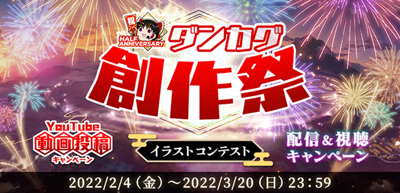 2022年2月4日(金)から、ハーフアニバーサリーを記念して、「ダンカグ創作祭」を開催中です!YouTubeでの動画投稿キャンペーン、pixivでのイラストコンテスト、Mirrativでの配信&視聴キャンペーンの3つを実施しています。