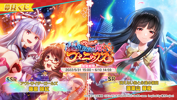 この新ミタマカードのほか、復刻登場するSSRミタマカード「[「サブタレイニアンローズ」]古明地 こいし」、SSRミタマカード「[願わくは花の下にて春死なむ]西行寺 幽々子」は、本夢見くじの開催期間中のみ登場します。