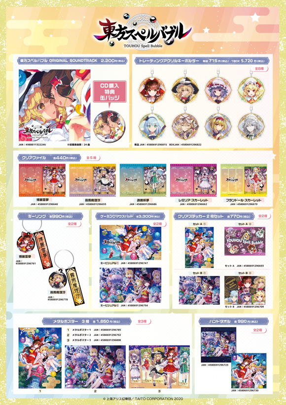 人気イラストレーター、荻poteさん書下ろしのジャケットイラストを使用した『東方スペルバブル』サウンドトラックCDや、トレーディングアクリルキーホルダー、クリアファイル、キーリング、ゲーミングマウスパッド、クリアステッカー、メタルポスター、ハンドタオルをラインナップ展開いたします。また、グッズの発売時期は7月下旬を予定しています。
