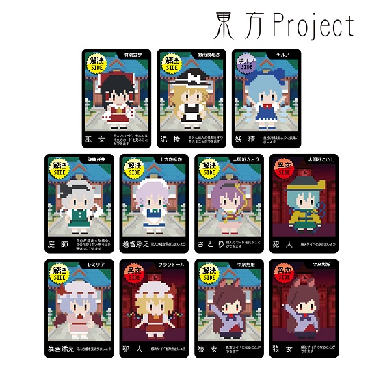博麗霊夢、霧雨魔理沙、チルノ、魂魄妖夢、十六夜咲夜、古明地さとり、古明地こいし、レミリア・スカーレット、フランドール・スカーレット、今泉影狼をドット絵風に描き起こしたイラストを、東方Projectの世界観に沿った役職名と合わせてワンナイト人狼のカードに落とし込みました。