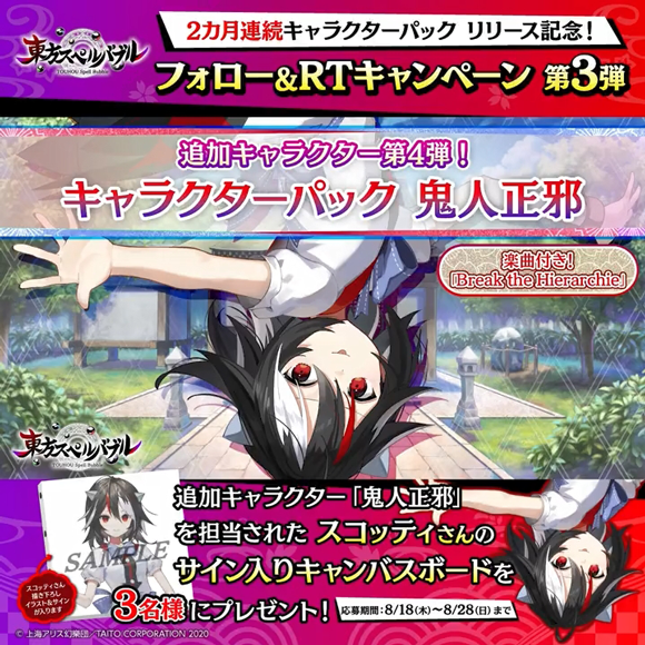 2カ月連続キャラクターパックのリリースを記念して、東方スペルバブル公式Twitter(@touhouSB)をフォロー&リツイートで「鬼人正邪」のイラストを担当された、スコッティさんの描き下ろしイラストと直筆サイン入りの限定キャンバスボードを抽選で3名様にプレゼント!