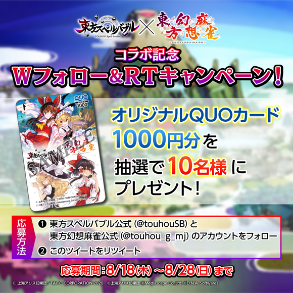 『東方幻想麻雀』コラボを記念して、東方スペルバブル(@touhouSB)と東方幻想麻雀(@touhou_g_mj)公式TwitterアカウントのWフォロー&リツイートでコラボ限定のオリジナルQUOカードを抽選でプレゼント!