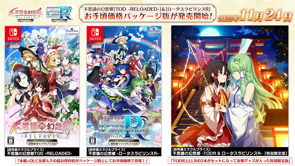 株式会社Phoenixx(フィーニックス)は、「東方Project」ファンゲーム『不思議の幻想郷TOD -RELOADED-』ならびに『不思議の幻想郷 -ロータスラビリンスR-』(制作:AQUASTYLE)のNintendo Switch™版において、ゲーム本編と全ての追加コンテンツを収録した新価格パッケージ版を2作品同時に本日2022年11月24日(木)より販売開始したことをお知らせいたします。