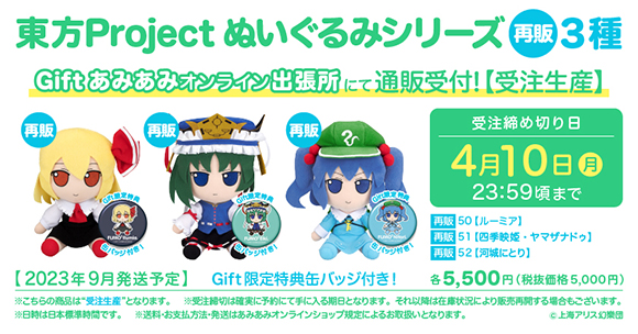 【Gift】東方ぬいぐるみシリーズ再販3種通販受付中!(るーみあ/えいき/にとり)