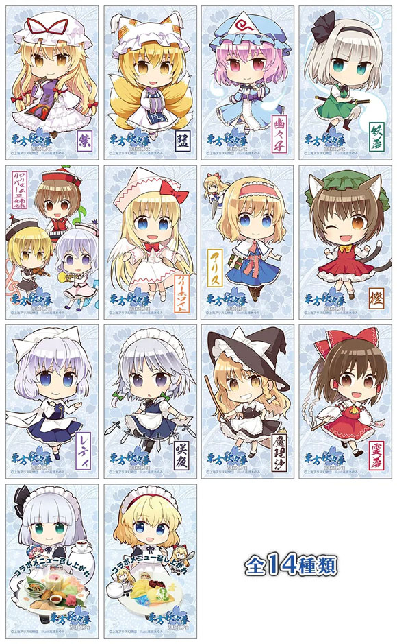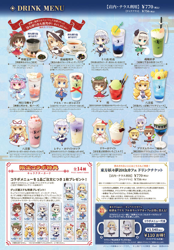 キュアメイドカフェ店内や同フロア、ジーストア・アキバ、オノデン新館1Fの「東方やおよろず商店 ポップアップショップ」 にて、『東方Project』関連商品を1,500円(税込)ご購入・ご予約ごとに、カフェで配布している【コラボ限定キャラクターカード(全14種)】をランダムで1枚お渡しします。コラボカフェと合わせてご利用ください。