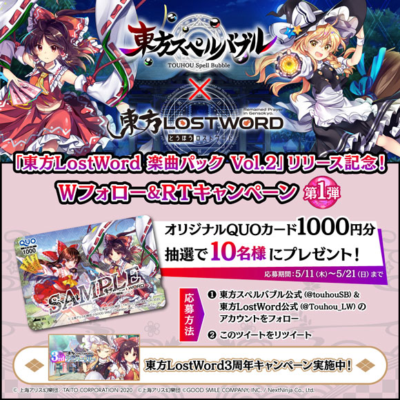 東方スペルバブル公式Twitter(@touhouSB)と東方LostWord 公式Twitter(@Touhou_LW)をWフォロー&リツイートでコラボ限定のオリジナルQUOカードを抽選でプレゼント!